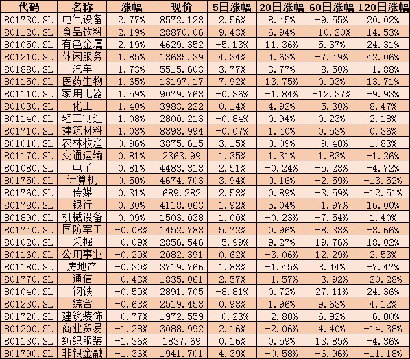 從申萬一級28個行業(yè)來看,周一,電氣設(shè)備、有色金屬和食品飲料等三行業(yè)漲幅居前均超2%,分別為2.77%、2.19%和2.19%。而紡織服裝、非銀金融和商業(yè)貿(mào)易跌幅均超1%。