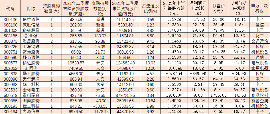 隨著2021年半年報陸續(xù)披露,險資持倉路線初露端倪。同花順數(shù)據(jù)統(tǒng)計發(fā)現(xiàn),截至8月2日,在已披露2021年半年報的上市公司中,有18家公司的前十大流通股股東中出現(xiàn)險資身影,合計持有4.44億股,累計持股市值達(dá)128.96億元。其中,有8家公司股票在今年二季度成為險資新進(jìn)增持的重點(diǎn)品種,這些公司股票主要扎堆在電子、通信等兩行業(yè),這兩行業(yè)均屬于科技領(lǐng)域,涉及個股數(shù)量均為2只。
