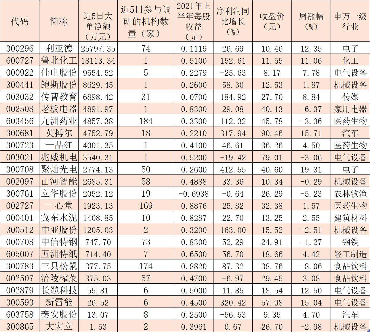 可以看到,近期市場做多資金也紛紛涌入部分機構(gòu)調(diào)研品種進行布局。統(tǒng)計顯示,在78只個股中,有24只個股上周呈現(xiàn)大單資金凈流入態(tài)勢,合計吸金10.54億元。其中,利亞德、魯北化工等2只個股期間均受到1億元以上大單資金搶籌,佳電股份、鮑斯股份、傳智教育、老板電器、九洲藥業(yè)、英搏爾、一品紅等7只個股期間累計大單資金凈流入也均逾4000萬元。