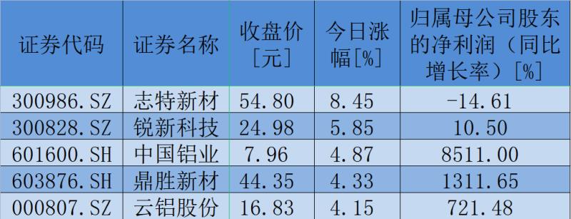 表:9月6日,申萬(wàn)鋁板塊股價(jià)漲幅超4%個(gè)股一覽