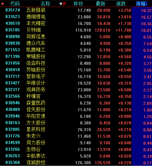 值得關(guān)注的是,新三板精選層延續(xù)強(qiáng)勢(shì),24只個(gè)股飄紅。五新隧裝、德瑞鋰電、豐光精密、貝特瑞等個(gè)股漲幅均在10%以上。其中,五新隧裝9月份以來(lái)漲幅達(dá)到143.79%。