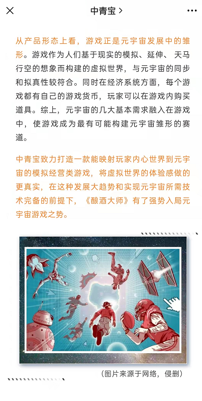 今日早盤,“元宇宙”概念的爆發(fā)與一則消息有關(guān)。中青寶在官方微信上表示,將推出虛擬與現(xiàn)實(shí)夢(mèng)幻聯(lián)動(dòng)模擬經(jīng)營(yíng)類的元宇宙游戲《釀酒大師》,這是一次打破次元壁的嘗試,游戲與真實(shí)邊界開(kāi)始走向消融。