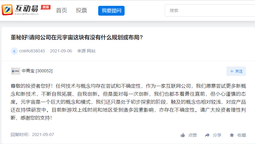 昨日,中青寶對投資者在互動平臺上的問題“請問公司在元宇宙這塊有沒有什么規(guī)劃或布局?”作出回應。