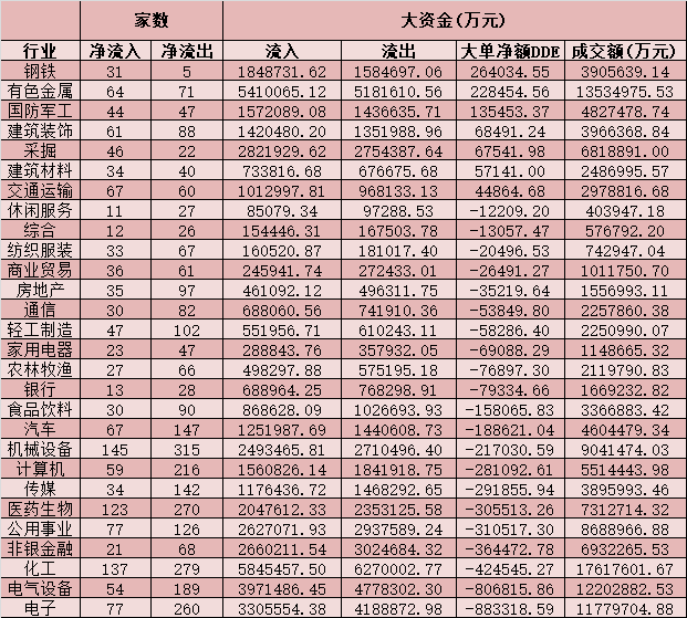 資金流向方面,周四,滬深兩市大單資金凈流出380.97億元,從申萬(wàn)一級(jí)行業(yè)來(lái)看,僅7個(gè)行業(yè)呈現(xiàn)資金流入態(tài)勢(shì),鋼鐵和有色金屬等兩行業(yè)大單資金凈流入均在20億元以上。