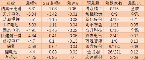 今天新能源電池概念遭遇逆風,各大概念均出現(xiàn)下跌,前十位下跌的板塊中占比超八成。以鈉離子電池居首下跌6.31%,隨著的是刀片電池(-6.04%)、鹽湖提鋰(-5.51%)、HIT電池(-5.03%)、固態(tài)電池(-4.91%)等,跌幅均在4%以上。多只千億市值的鋰礦股跌停,光伏和儲能板塊也被帶崩了。