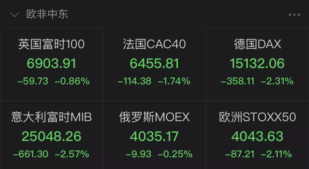 與此同時,歐洲主要國家股指跌幅均超1%,其中,德國DAX 30指數(shù)收跌2.3%,也創(chuàng)下7月19日以來最大跌幅。