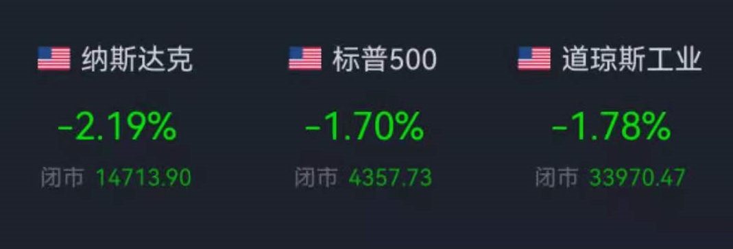 可以看到,周一,美股三大指數(shù)集體重挫。截至收盤,道瓊斯工業(yè)指數(shù)跌1.78%,報33970.47點;標普500指數(shù)跌1.70%,報4357.73點;納斯達克指數(shù)跌2.19%,報14713.90點;納指和標普500指數(shù)創(chuàng)4個月以來最大單日跌幅。