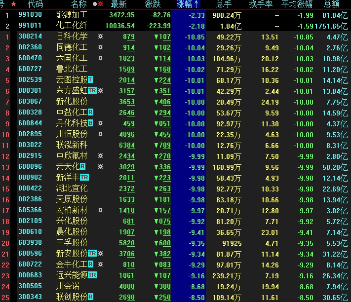 而此前表現(xiàn)搶眼的化工、煤炭石油板塊則處于跌幅榜前列。其中,有17只化工概念股以跌停報(bào)收。