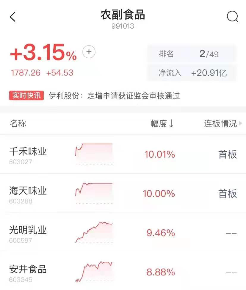 具體來(lái)看,周五,在經(jīng)歷了股價(jià)持續(xù)低迷的食品飲料概念股出現(xiàn)大漲,板塊漲幅達(dá)3.54%。其中,海天味業(yè)、千禾味業(yè)等兩大醬油股罕見(jiàn)聯(lián)袂漲停,此外,乳業(yè)、白酒概念亦表現(xiàn)強(qiáng)勢(shì),妙可藍(lán)多、迎駕貢酒、金種子酒等大漲,貴州茅臺(tái)、五糧液漲近4%。股民紛紛表示:這是王者回歸啊,茅概念的春天回來(lái)了!