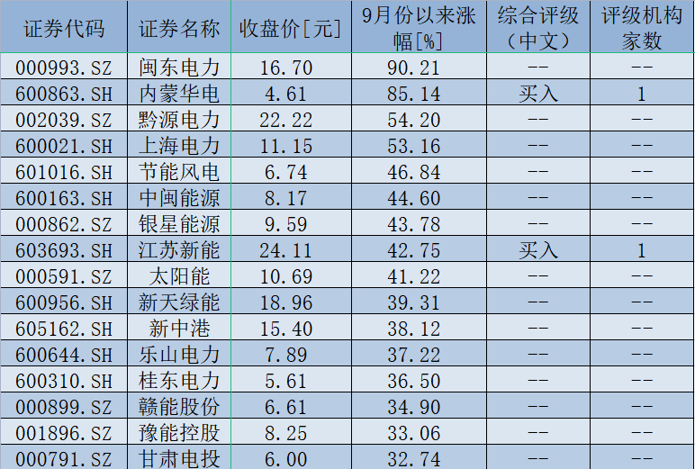 表:9月份以來,截至10月11日電力板塊漲幅超過30%個股一覽