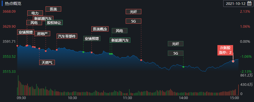 10月12日,A股市場深幅調(diào)整,三大指數(shù)集體跌超1%,截至收盤,上證指數(shù)跌1.25%,深證成指跌1.62%,創(chuàng)業(yè)板指跌1.81%;滬深兩市合計(jì)成交額9965.90億元;北向資金凈賣出13.79億元;總體來看,兩市個(gè)股普跌,超3600只個(gè)股下跌。