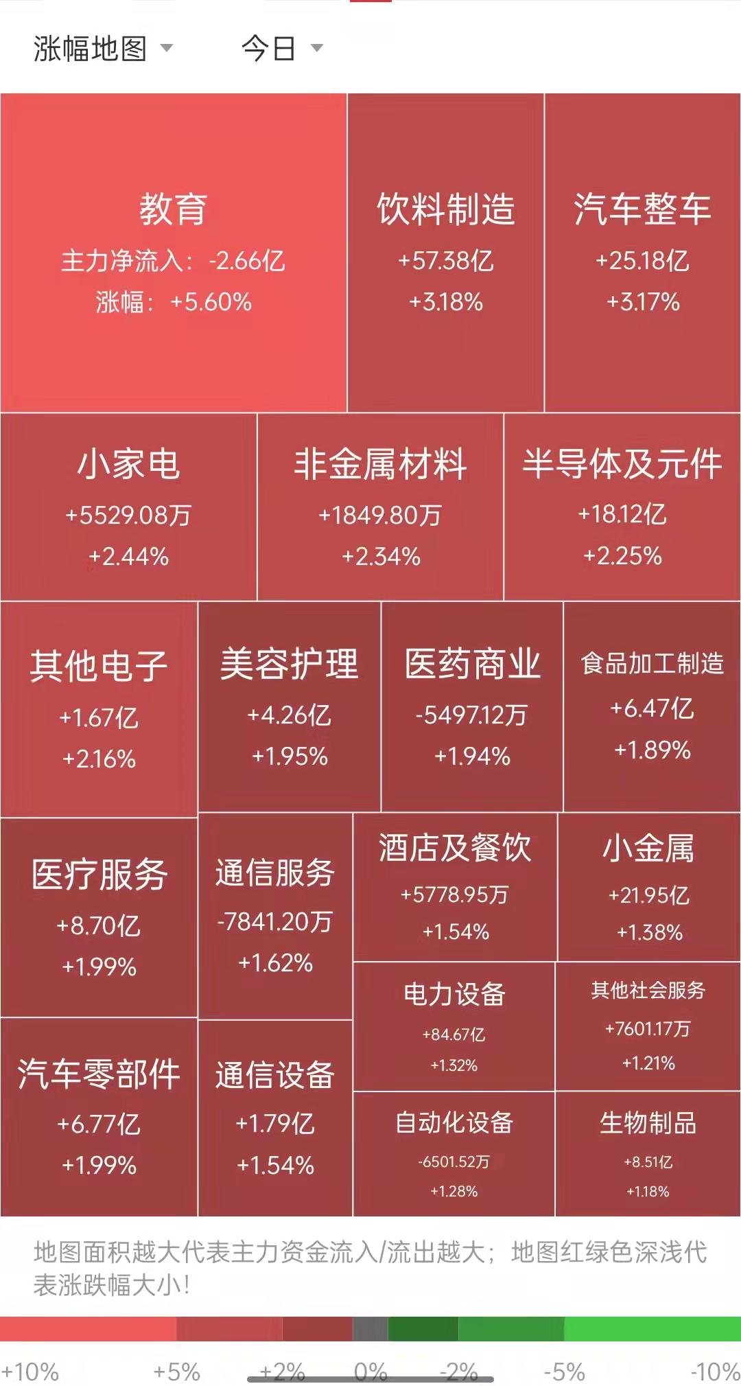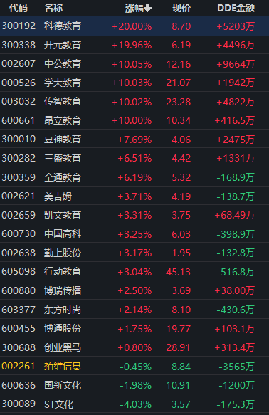 漲幅居首的教育板塊,漲幅達(dá)5.60%,18只交易中的個(gè)股有15只上漲,其中,科德教育、開元教育、中公教育、學(xué)大教育、傳智教育、昂立教育等個(gè)股漲停報(bào)收。