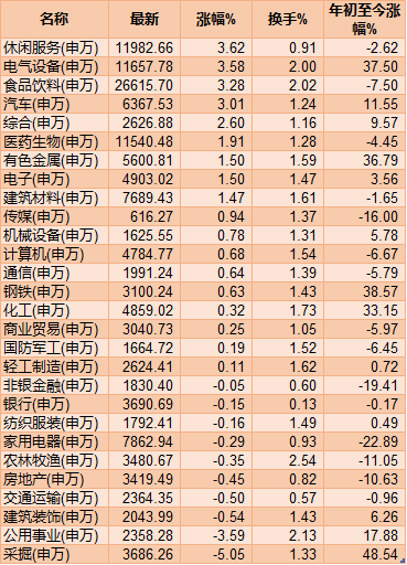 從申萬一級行業(yè)板塊來看,有18類行業(yè)上漲,休閑服務(wù)、電氣設(shè)備、食品飲料、汽車等4類行業(yè)漲幅均超3%,采掘、公用事業(yè)跌幅較大,出現(xiàn)大批跌停股。