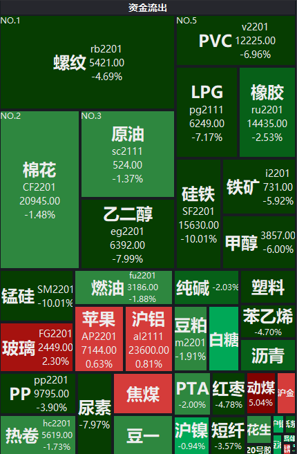 10月13日,期市午盤收盤,黑色系跌幅領(lǐng)先,錳硅、硅鐵封跌停板,能化商品大面積下跌,乙二醇、PVC跌停,尿素、液化石油氣跌超7%,甲醇跌6%,鐵礦跌近6%,紅棗、苯乙烯、螺紋跌超4%;漲幅方面,動力煤主力合約漲超5%,焦炭、玻璃漲逾2%。