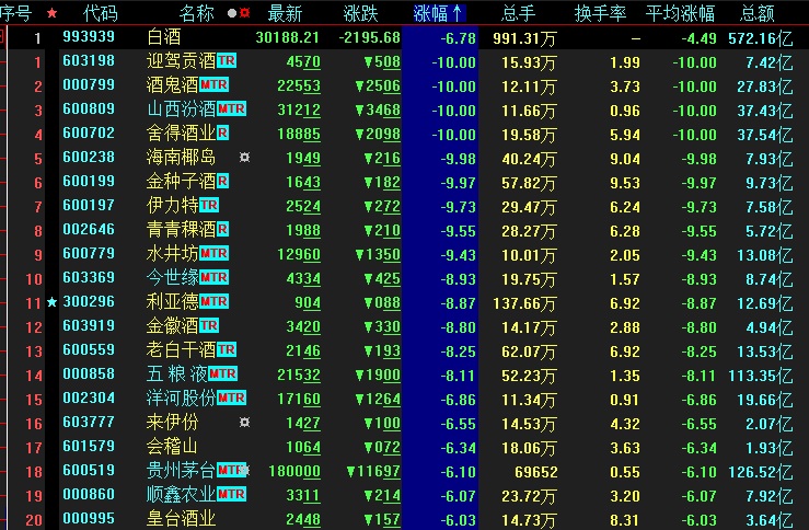 周一,與大幅飆升的煤炭股相比,“白酒股大跌”的消息不斷被刷屏,并登上熱搜。截至收盤,白酒板塊全線重挫,跌幅達(dá)6.78%。海南椰島、迎駕貢酒、山西汾酒、酒鬼酒等均以跌停價(jià)報(bào)收,五糧液跌逾8%,貴州茅臺也以6.1%的跌幅收盤。據(jù)測算,周一,整個(gè)白酒板塊市值蒸發(fā)逾3000億元。