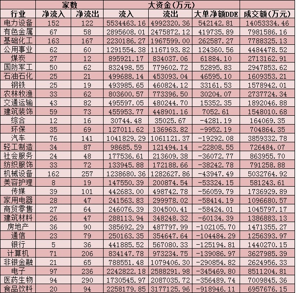 表:周一(10月18日)申萬一級行業(yè)大單資金流向的情況:
