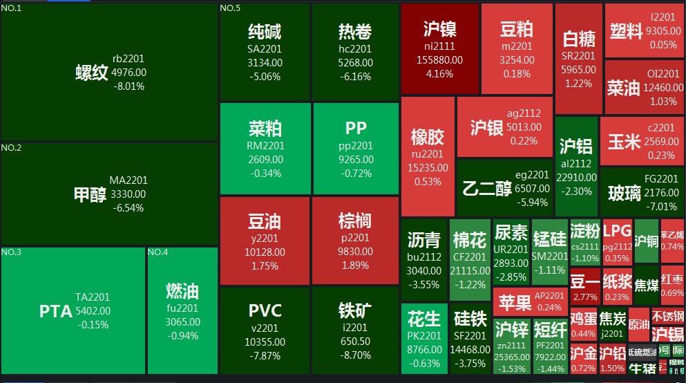 10月21日,國內(nèi)商品期貨收盤,黑色系大跌,焦炭、焦煤、動(dòng)力煤、螺紋、玻璃跌停,鐵礦跌超9%;值得注意的是,期市交投情緒火熱,螺紋、滬鎳、橡膠、豆油、棕櫚、滬深2111合約成交金額均超1000億,其中螺紋成交額超2000億元。截至收盤,螺紋鋼跌8.01%,報(bào)4976元;滬鎳漲4.16%,報(bào)155880元;橡膠漲0.53%,報(bào)15235元;豆油漲1.75%,報(bào)10128元;棕櫚油漲1.89%,報(bào)9830元。