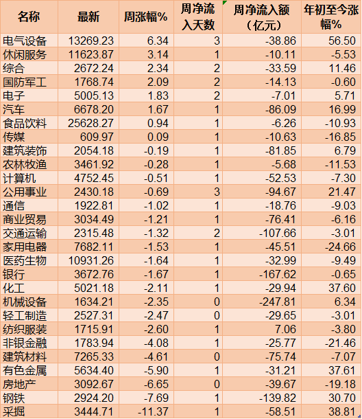 從申萬一級行業(yè)來看,本周逾8類申萬一級行業(yè)實現(xiàn)上漲,其中,電氣設(shè)備(6.34%)、休閑服務(wù)(3.14%)、綜合(2.34%)、國防軍工(2.09%)等4類行業(yè)指數(shù)周漲幅均超2%。此外,采掘(-11.37%)、鋼鐵(-7.69%)、房地產(chǎn)(-6.65%)、有色金屬(-5.90%)等4類行業(yè)指數(shù)周跌幅均超5%。