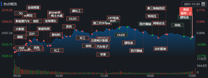 11月1日,A股三大指數(shù)盤中分化,收盤漲跌不一,截至收盤,上證指數(shù)跌0.08%,深證成指漲0.17%,創(chuàng)業(yè)板指跌0.56%;滬深兩市合計(jì)成交額12231.59億元,兩市成交額連續(xù)第7個(gè)交易日突破1萬(wàn)億元;總體來(lái)看,兩市個(gè)股漲多跌少,上漲股達(dá)3111只。