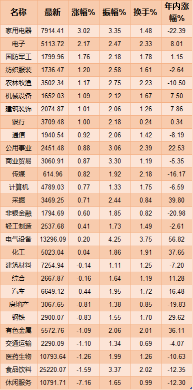 從申申萬(wàn)一級(jí)行業(yè)看,11月1日,有18類行業(yè)實(shí)現(xiàn)上漲,其中,家用電器和電子行業(yè)漲幅均在2%以上。另外,休閑服務(wù)行業(yè)跌幅居首,超過(guò)7%。