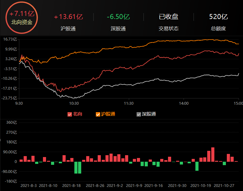 11月1日,北向資金凈買入7.11億元,其中,滬股通凈買入額達(dá)13.61億元,深股通凈賣出額達(dá)6.5億元。