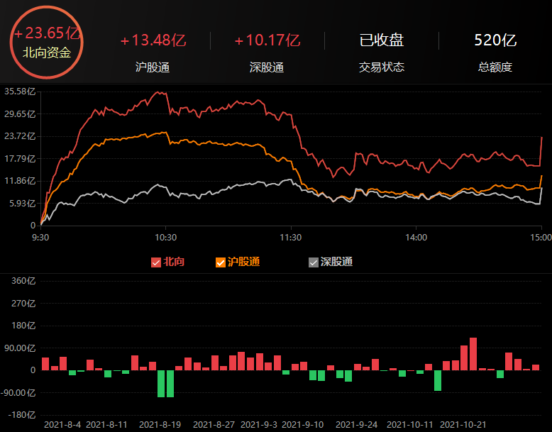 11月2日,北向資金凈買入23.65億元,其中,滬股通凈買入額達(dá)13.48億元,深股通凈買入額達(dá)10.17億元。