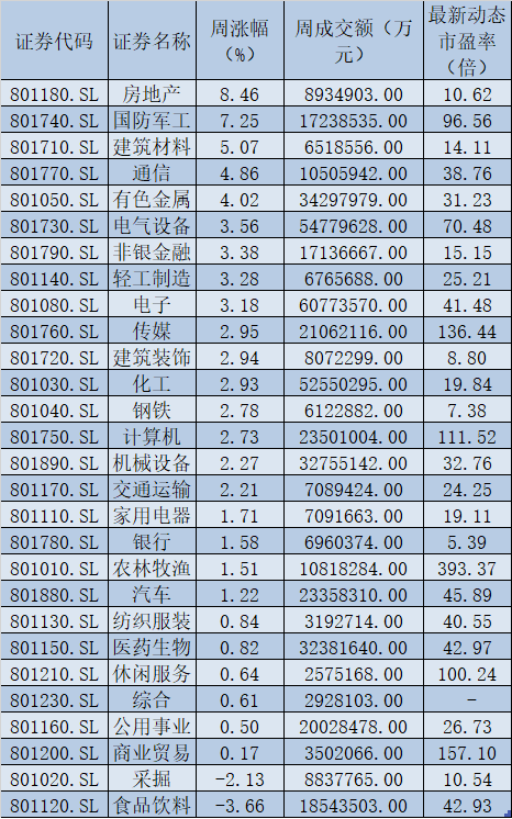 從申萬一級行業(yè)來看,本周有26個行業(yè)實現(xiàn)上漲,其中,房地產(chǎn)、國防軍工、建筑材料等行業(yè)指數(shù)周漲幅均超5%。另外,食品飲料和采掘等行業(yè)指數(shù)周跌幅則均超2%。