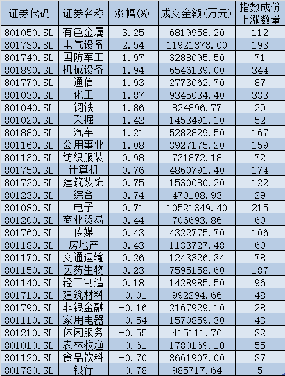 從申萬(wàn)一級(jí)行業(yè)來(lái)看,有21個(gè)行業(yè)實(shí)現(xiàn)上漲,其中,有色金屬、電氣設(shè)備等行業(yè)漲幅居前均超2%,漲幅分別為3.25%、2.54%;另外,銀行、食品飲料、農(nóng)林牧漁等行業(yè)則震蕩走低。