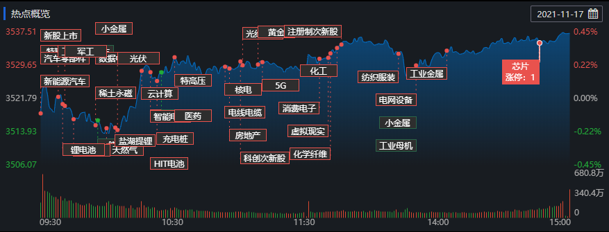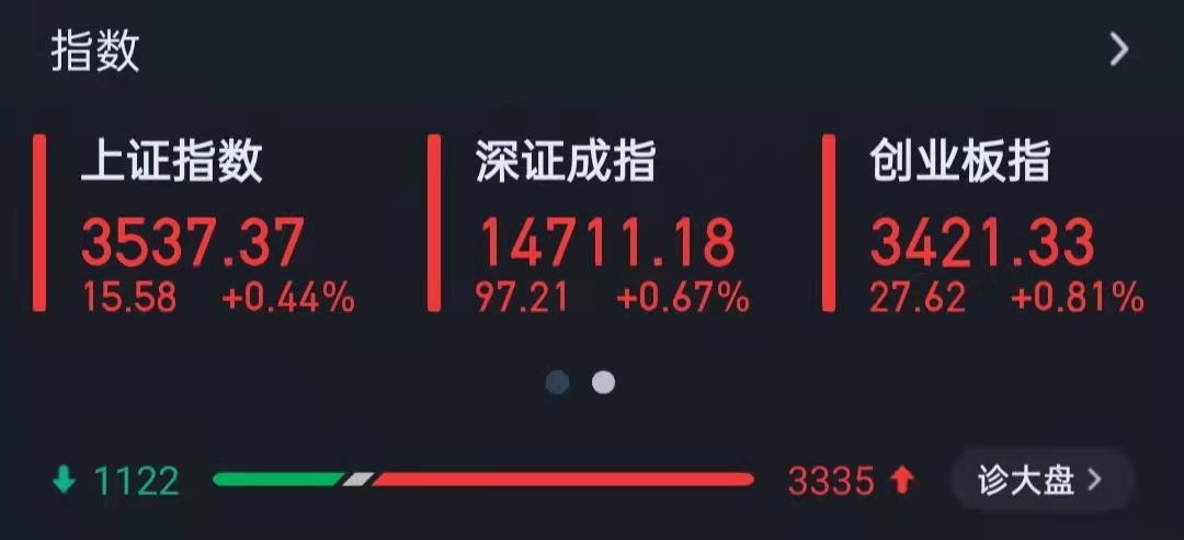 11月17日,A股三大指數(shù)集體上漲,截至收盤(pán),上證指數(shù)漲0.44%,報(bào)3537.37點(diǎn);深證成指漲0.67%,報(bào)14711.18點(diǎn);創(chuàng)業(yè)板指漲0.81%,報(bào)3421.33點(diǎn);滬深兩市合計(jì)成交額10371.76億元,連續(xù)第19個(gè)交易日突破1萬(wàn)億元;總體來(lái)看,兩市個(gè)股普漲。