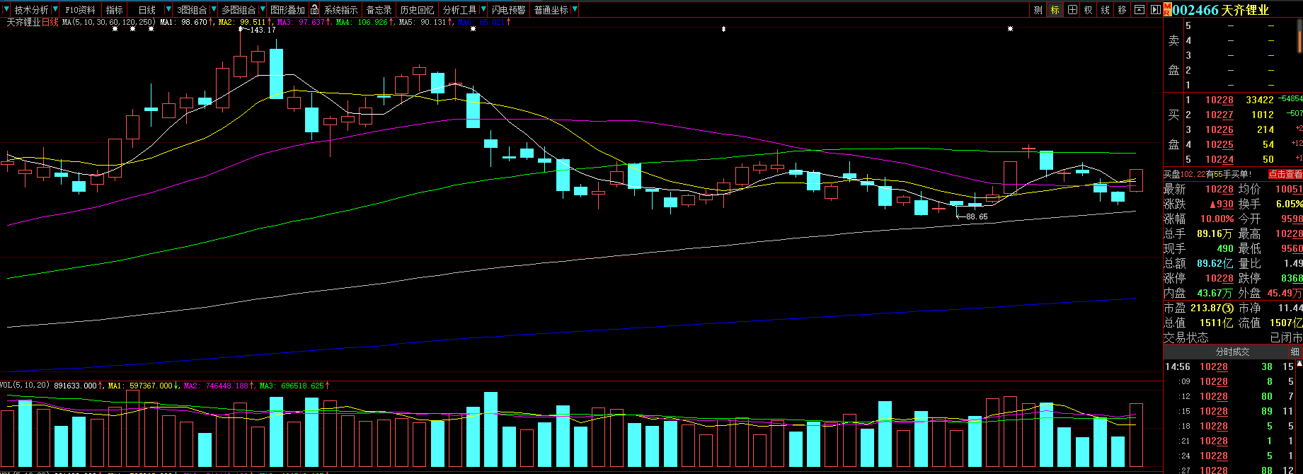 在今日股價(jià)漲停的個(gè)股中,天齊鋰業(yè)最新總市值再次超過(guò)1500億元。
