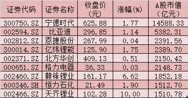 表:截至11月17日收盤(pán)總市值在1500億元以上的鋰電池概念股