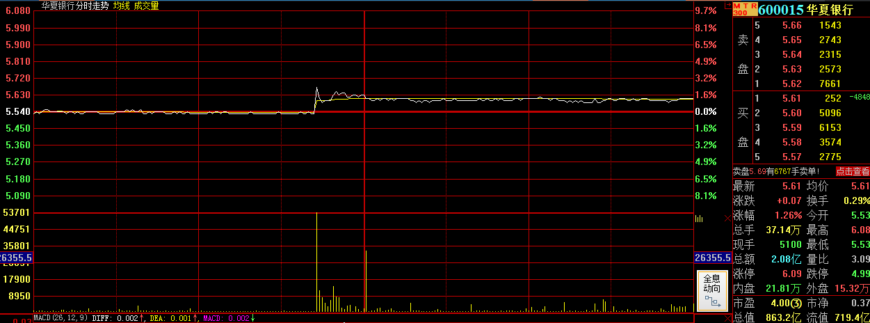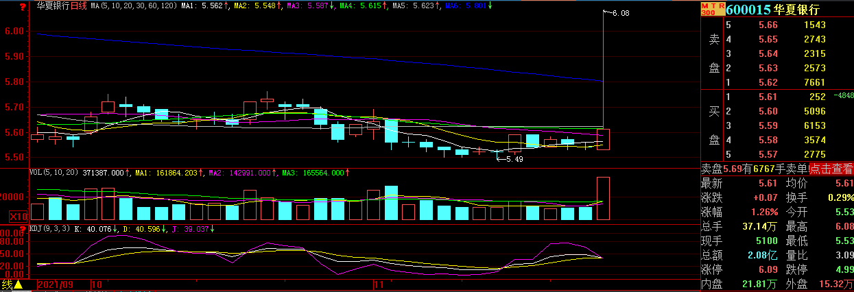 截至收盤,華夏銀行報(bào)價(jià)5.61元,漲幅1.26%。