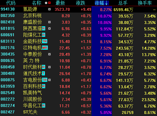 11月18日,氫能源概念股大面積飄紅,包括北京科銳、康盛股份、陜西黑貓等在內(nèi)的5只概念股集體漲停,金能科技、中泰股份、英力特等個(gè)股也紛紛跟漲。