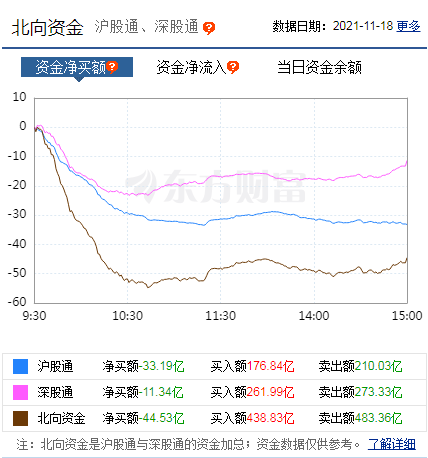 北向資金延續(xù)凈流出態(tài)勢(shì),11月18日,北向資金凈賣出44.53億元,其中,滬股通凈賣出33.19億元,深股通凈買入11.34億元。