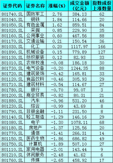 從申萬(wàn)一級(jí)行業(yè)來(lái)看,有9個(gè)行業(yè)實(shí)現(xiàn)上漲,其中,國(guó)防軍工行業(yè)領(lǐng)漲,漲幅達(dá)到2.76%,鋼鐵和有色金屬等行業(yè)漲幅也均在1%以上,漲幅分別為1.84%、1.62%;另外,傳媒、休閑服務(wù)、家用電器等行業(yè)則震蕩走低,跌幅均超2%。