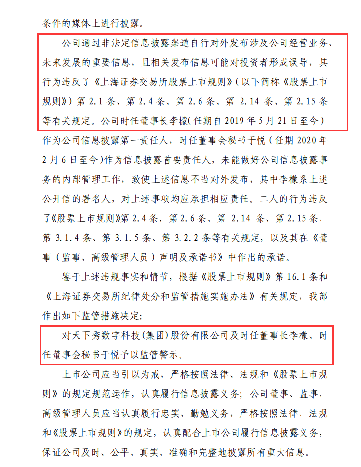 11月19日,上交所對天下秀及有關(guān)責(zé)任人予以監(jiān)管警示:公司通過非法定信息披露渠道自行對外發(fā)布涉及公司經(jīng)營業(yè)務(wù)、未來發(fā)展的重要信息,且相關(guān)發(fā)布信息可能對投資者形成誤導(dǎo)。公司時任董事長李檬、時任董事會秘書于悅致使上述信息不當(dāng)對外發(fā)布,予以監(jiān)管警示。