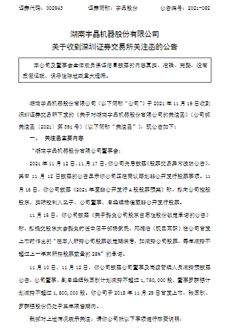 11月19日,深交所向宇晶股份發(fā)出關(guān)注函。要求說明公司上市尚未滿三年的情況下,籌劃非公開發(fā)行、控制權(quán)變更事項的原因,以及本次發(fā)行完成后認(rèn)定楊宇紅、楊佳葳二人為公司共同實(shí)際控制人具體依據(jù)。