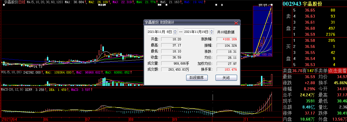 宇晶股份股價從11月8日起就開始連續(xù)上漲,最近8個交易日內(nèi)收獲6個漲停,11月19日盤中,宇晶股份股價一度觸及漲停價37.17元,最終收報36.59元,漲幅8.29%??梢钥吹剑?1月8日至今公司股價已經(jīng)翻倍,累計漲幅達(dá)到100.16%。