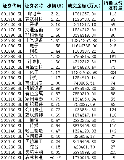 從申萬一級行業(yè)來看,周五僅農(nóng)林牧漁行業(yè)指數(shù)微跌0.49%,其他行業(yè)指數(shù)均呈現(xiàn)不同程度的上漲,其中,房地產(chǎn)行業(yè)領(lǐng)漲,漲幅達(dá)到3.21%,建筑材料和采掘等行業(yè)漲幅也均在2%以上。
