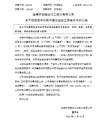 11月19日盤前,齊翔騰達(dá)公告稱,接到控股股東淄博齊翔石油化工集團(tuán)有限公司(以下簡稱“齊翔集團(tuán)”)通知,齊翔集團(tuán)于2021年11月17日收到中國證監(jiān)會《立案告知書》。因齊翔集團(tuán)涉嫌內(nèi)幕交易等違法違規(guī)行為,根據(jù)《中華人民共和國證券法》、《中華人民共和國行政處罰法》等法律法規(guī)的規(guī)定,中國證監(jiān)會決定對齊翔集團(tuán)進(jìn)行立案調(diào)查。