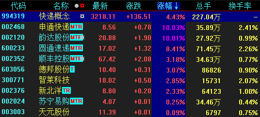 概念板塊方面,“雙11”快遞數(shù)據(jù)出爐,快遞股大面積飄紅領(lǐng)漲兩市。