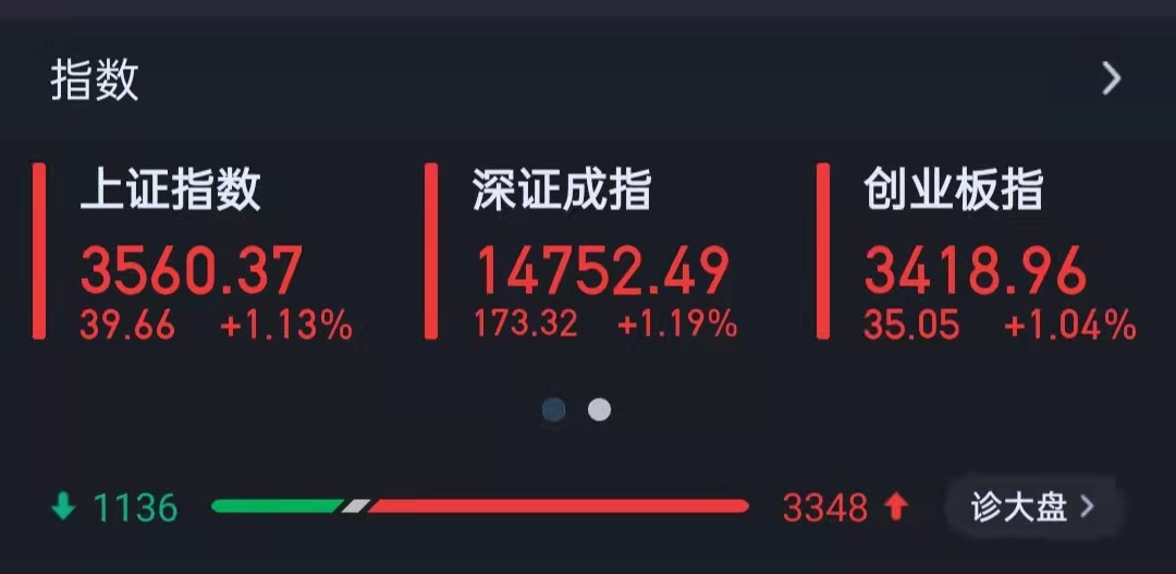 11月19日,A股三大指數(shù)持續(xù)拉升,集體漲超1%。截至收盤,上證指數(shù)漲1.13%,報3560.37點(diǎn);深證成指漲1.19%,報14752.49點(diǎn);創(chuàng)業(yè)板指漲1.04%,報3410.96點(diǎn);滬深兩市合計成交額11131.51億元,連續(xù)第21個交易日突破1萬億元。