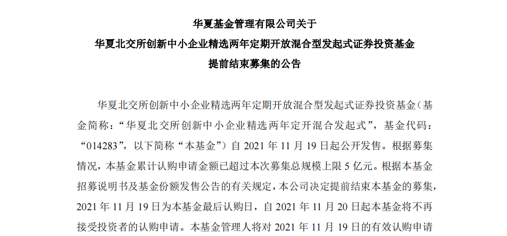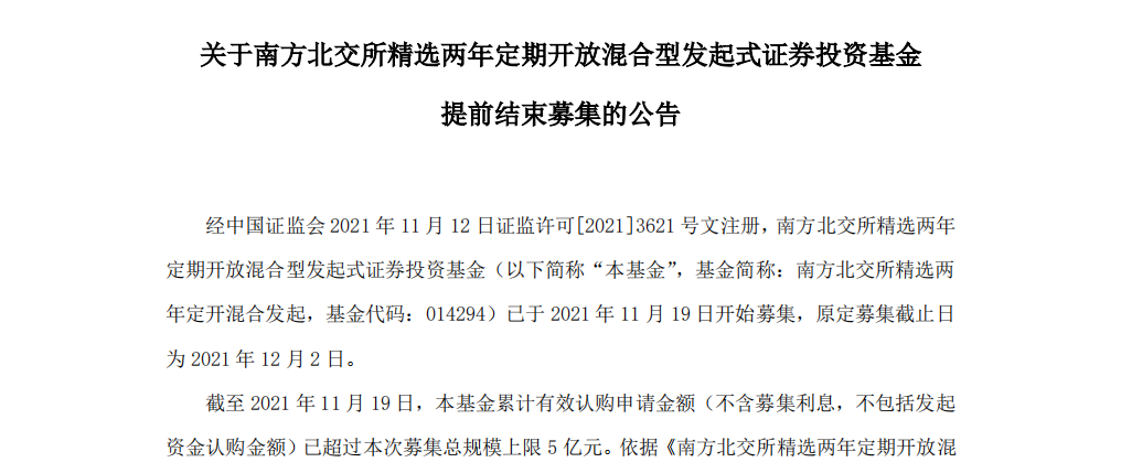 公告均稱,基金累計認購申請金額已超過募集總規(guī)模上限5億元,決定提前結束募集,11月19日為基金最后認購日。自11月20日起基金將不再接受投資者的認購申請。基金管理人對2021年11月19日的有效認購申請采用“末日比例確認”的原則給予部分確認,未確認部分的認購款項將在募集期結束后退還給投資者。比例確認的結果將另行公告。