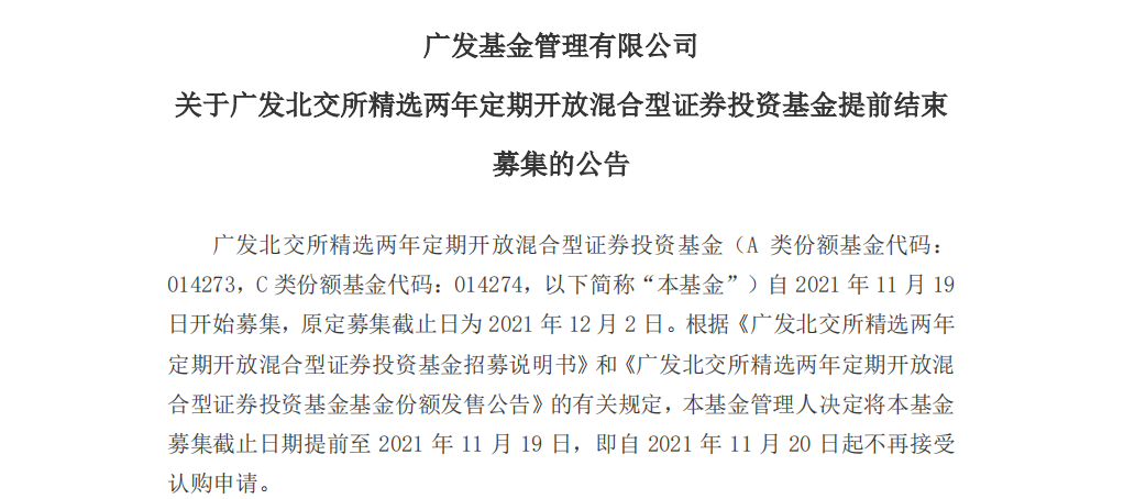 今日收盤后,華夏、南方、廣發(fā)這三家基金公司率先發(fā)布旗下北交所主題基金提前結束募集的公告。