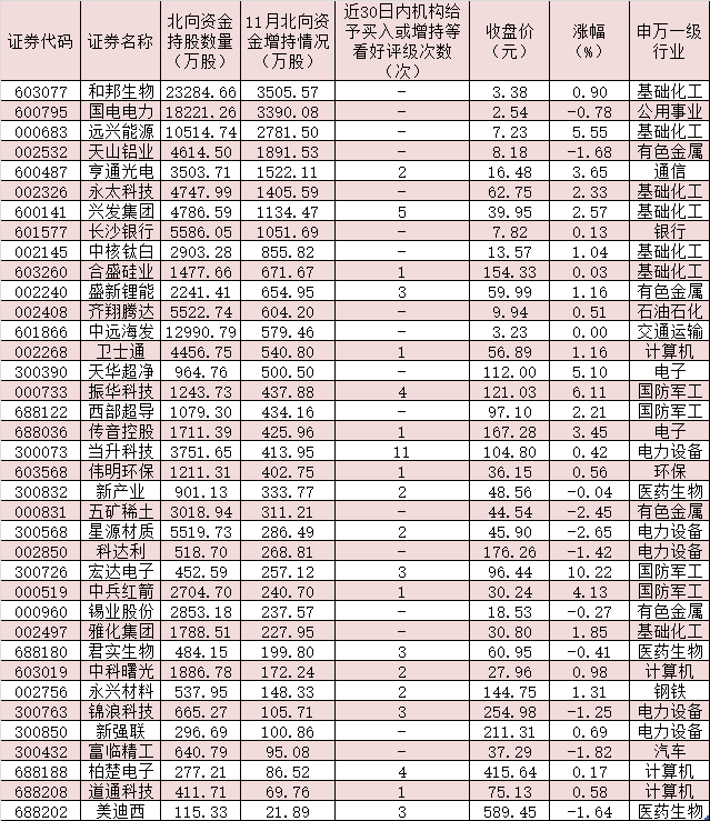 表:11月份獲北向資金增持的新納入MSCI中國(guó)A股指數(shù)成份股