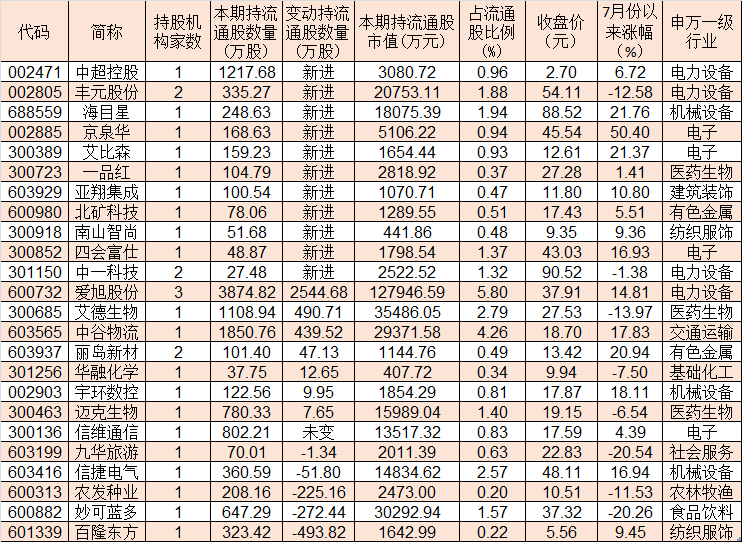從持股比例角度看,二季度QFII持股占流通股比例超過1%的公司有10家,且持股比例居前的公司有愛旭股份(5.80%)、中谷物流(4.26%)、艾德生物(2.79%)、信捷電氣(2.57%)等。