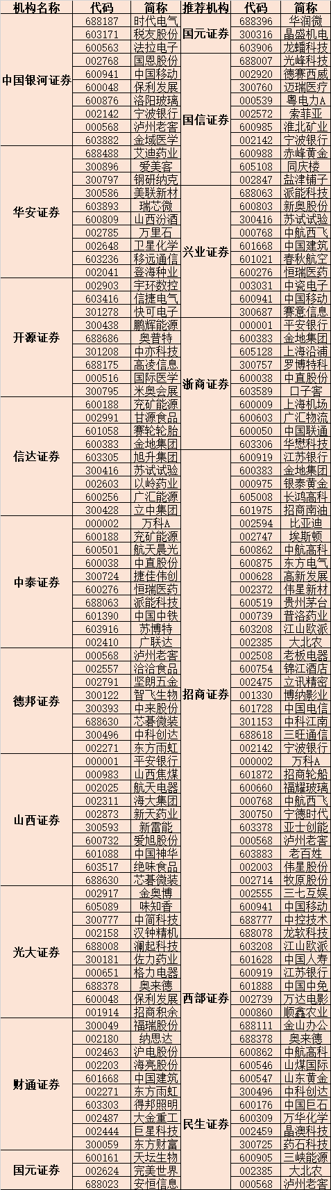從券商推薦的個股來看,上述151只金股中,有20只個股獲2家及以上券商推薦。其中,寧波銀行、中國移動、瀘州老窖、金地集團(tuán)等4只個股均獲3家券商聯(lián)合推薦。