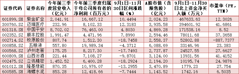 此次未對(duì)富時(shí)中國(guó)A50指數(shù)做出調(diào)整,說(shuō)明成份股整體運(yùn)行平穩(wěn),北上資金自上次調(diào)整后,也加倉(cāng)了部分成份股。通過(guò)梳理同花順陸股通每日十大成交活躍股發(fā)現(xiàn),9月1日至11月30日,11只個(gè)股獲北上資金加倉(cāng),合計(jì)凈買(mǎi)入額124.99億元。其中,紫金礦業(yè)、邁瑞醫(yī)藥。中國(guó)平安資金凈買(mǎi)入額分別為46.76億元、39.46億元和17.15億元;另有順豐控股、牧原股份、五糧液等6只個(gè)股凈買(mǎi)入額超1億元。