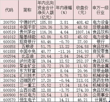 具體來(lái)看,寧德時(shí)代、中國(guó)平安、貴州茅臺(tái)等3只個(gè)股年內(nèi)累計(jì)北向資金凈買(mǎi)入額均超百億元,分別達(dá)到185.80億元、120.36億元和116.36億元,隆基綠能、招商銀行、五糧液、中國(guó)中免、比亞迪等5只個(gè)股年內(nèi)均受到20億元以上北向資金布局。