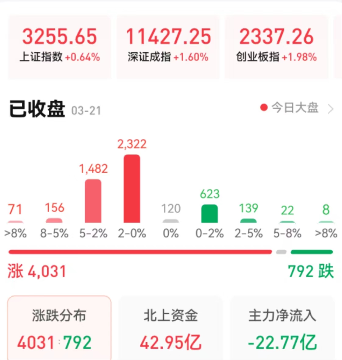 周二(3月21日),A股三大指數(shù)震蕩上行,全線飄紅。截至收盤,上證指數(shù)漲0.64%報3255.65點,深成指漲1.6%報11427.25點,創(chuàng)業(yè)板指漲1.98%報2337.26點;兩市合計成交金額達8930億元??傮w上看,兩市個股漲多跌少。其中,漲停個股達43只,跌停個股達10只。